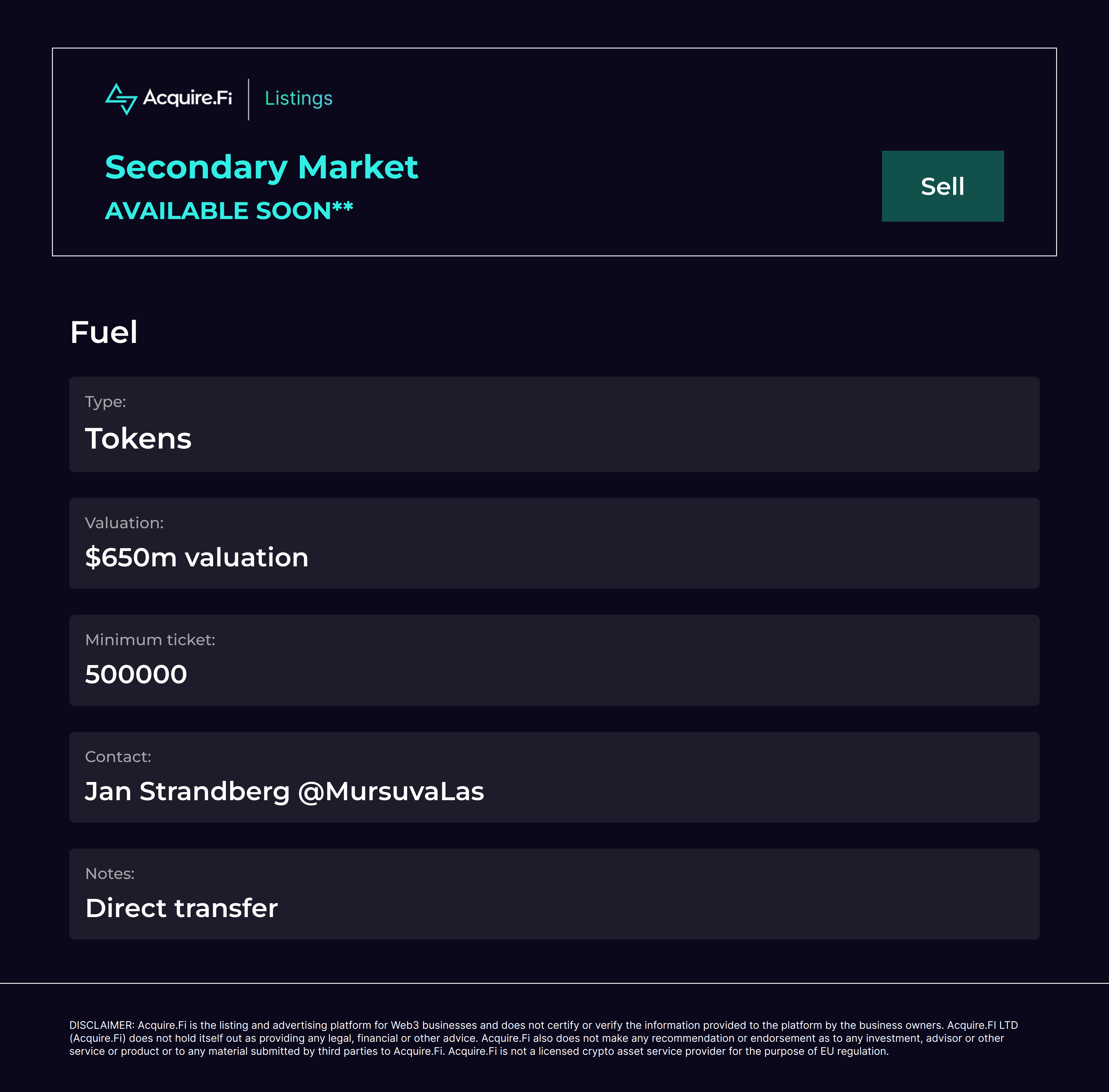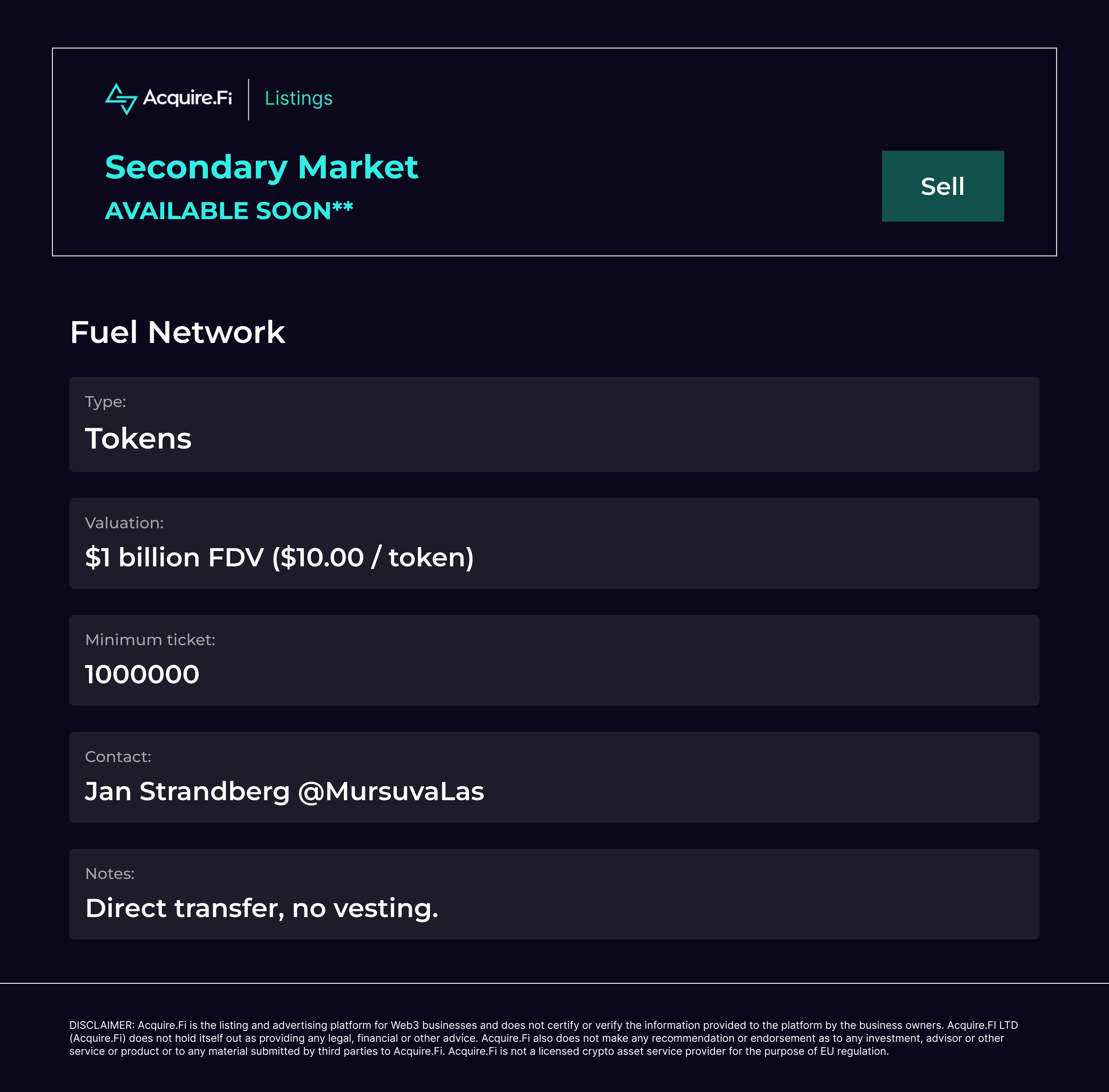 Secondary Market Sell: Fuel Network.