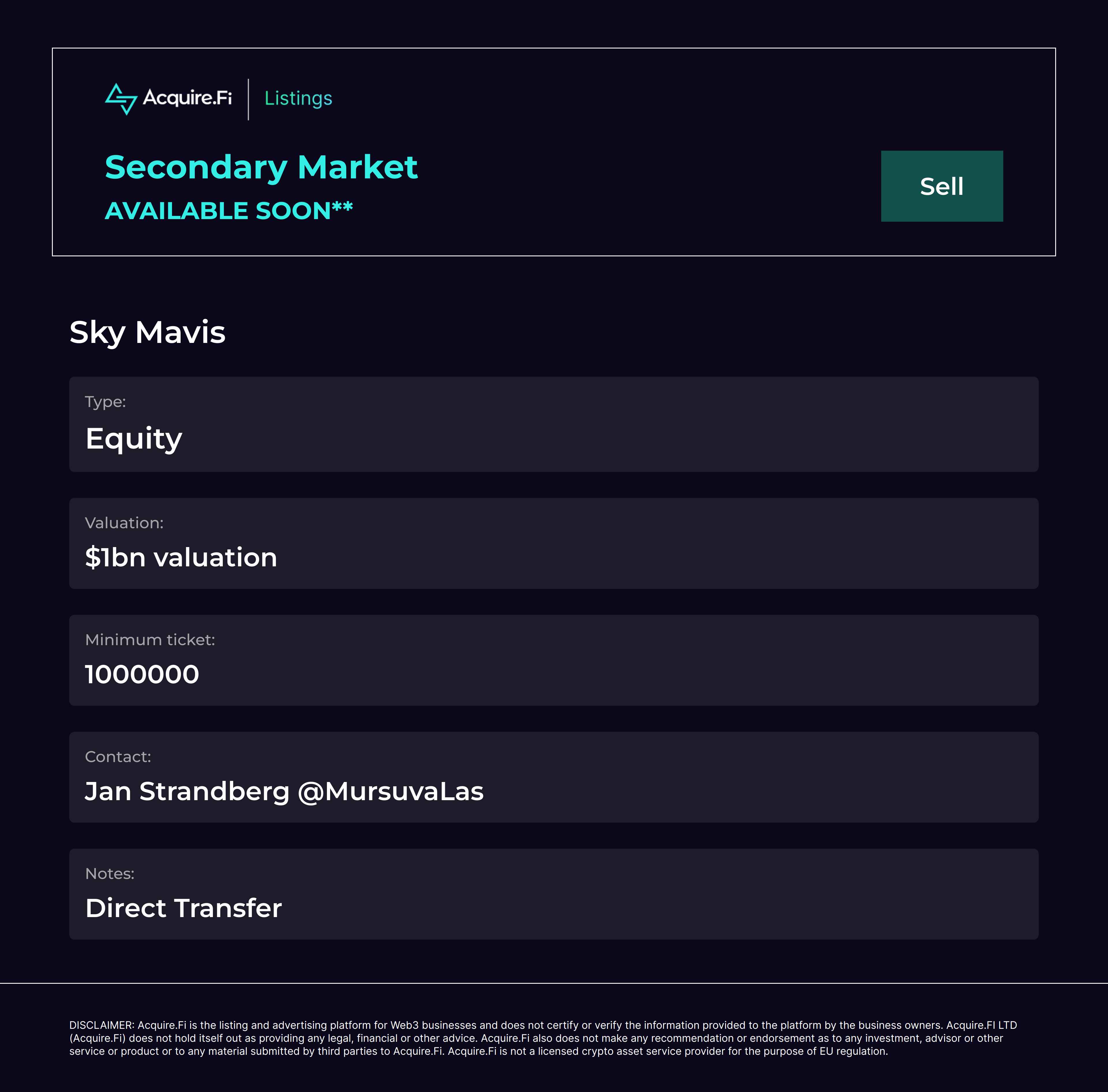 Secondary Market Sell: Sky Mavis.