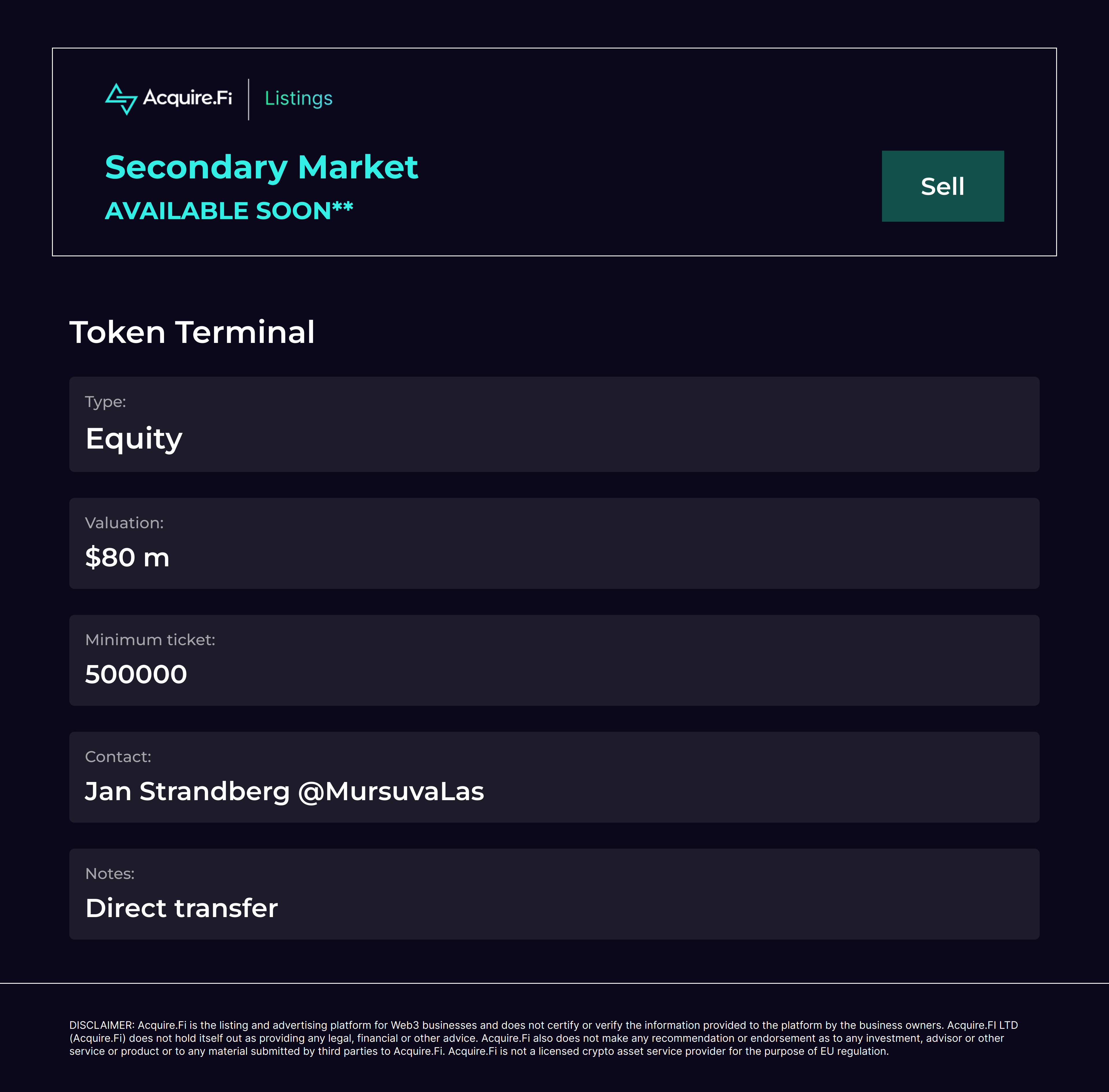 Secondary Market Sell: Token Terminal.